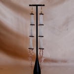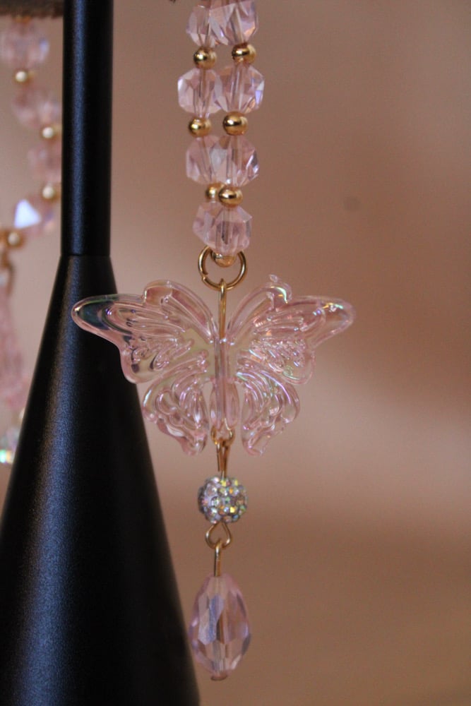 • Made from XL smooth white Dentalium shells, pink bi-cone crystal AB preciosa, 18k gold plated beads, brown deer leather, and pink butterfly charms. 18k gold plated hooks and findings.