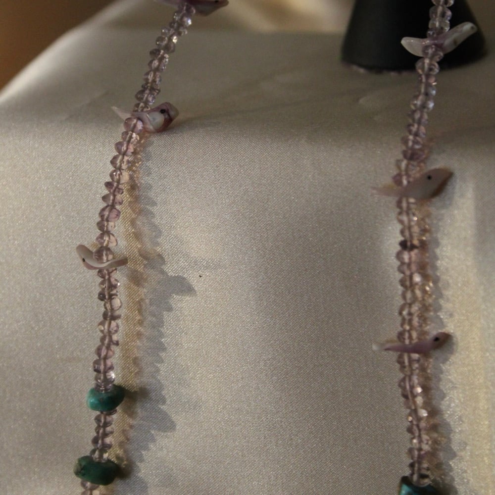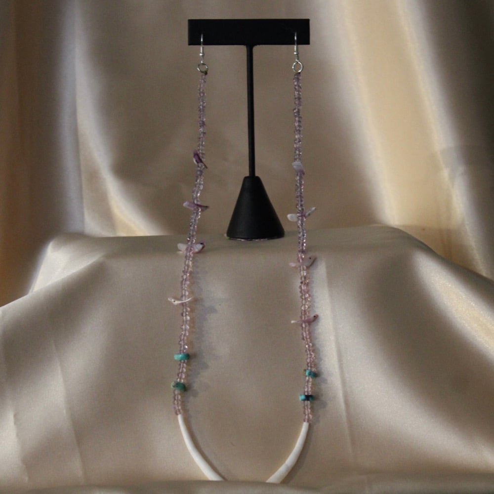• Made from XL smooth white Dentalium shells, deer leather, genuine rough cut amethyst beads, vintage purple spiny oyster bird beads, and vintage turquoise rondelle beads. Sterling silver hooks and findings.