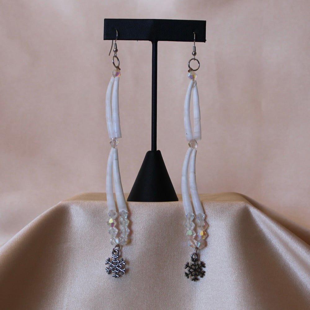 • Made from XL smooth white Dentalium shells, faceted crystal beads, and snowflake charms.