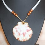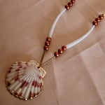 • Made from large smooth white Dentalium shells, brass tube beads, natural brown pearls, and a scallop pendant. 18k gold plated clasp and findings.