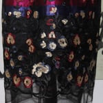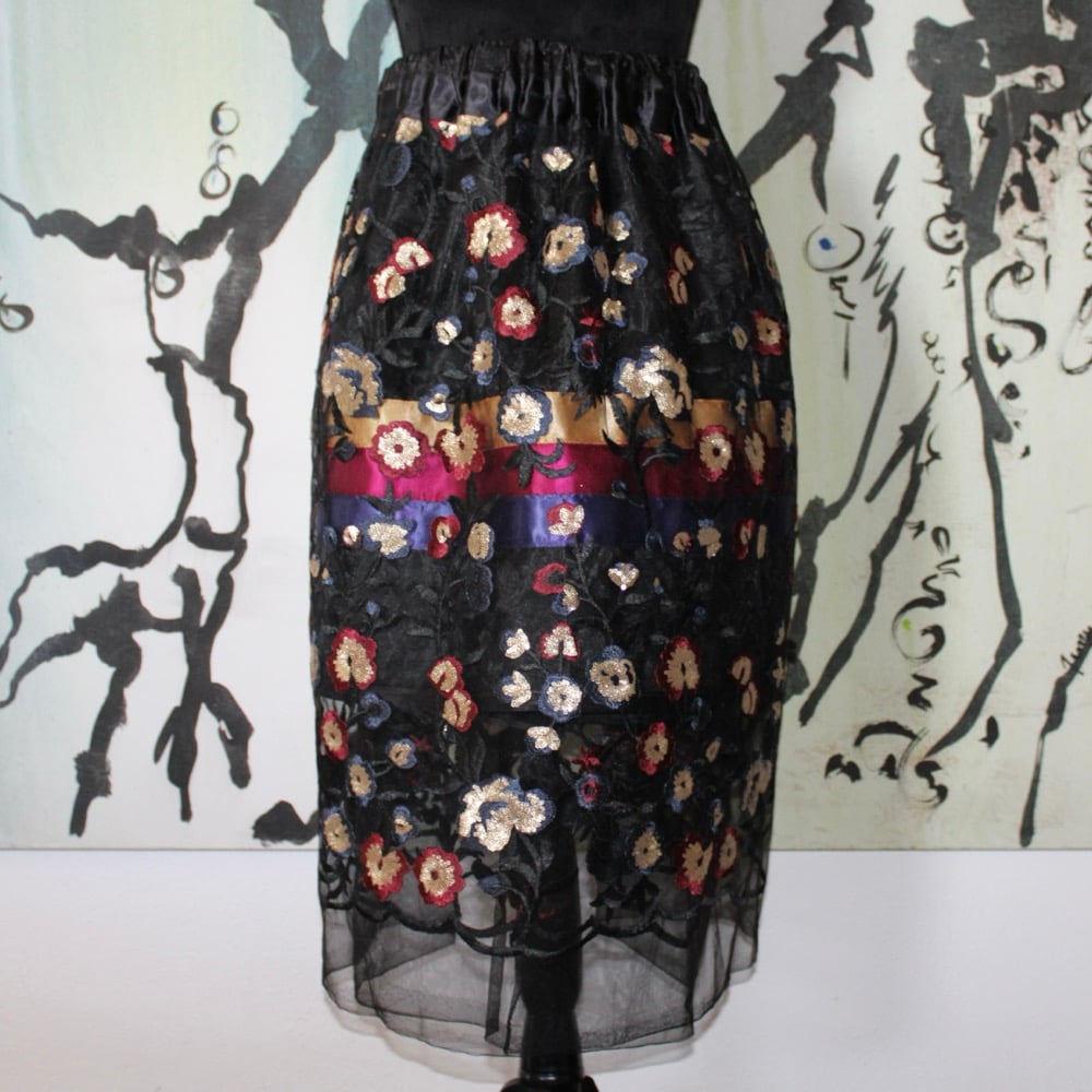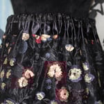 • Made from black floral satin fabric, sequined floral lace overlay, satin ribbons, satin bias trim, and an elastic waist band.