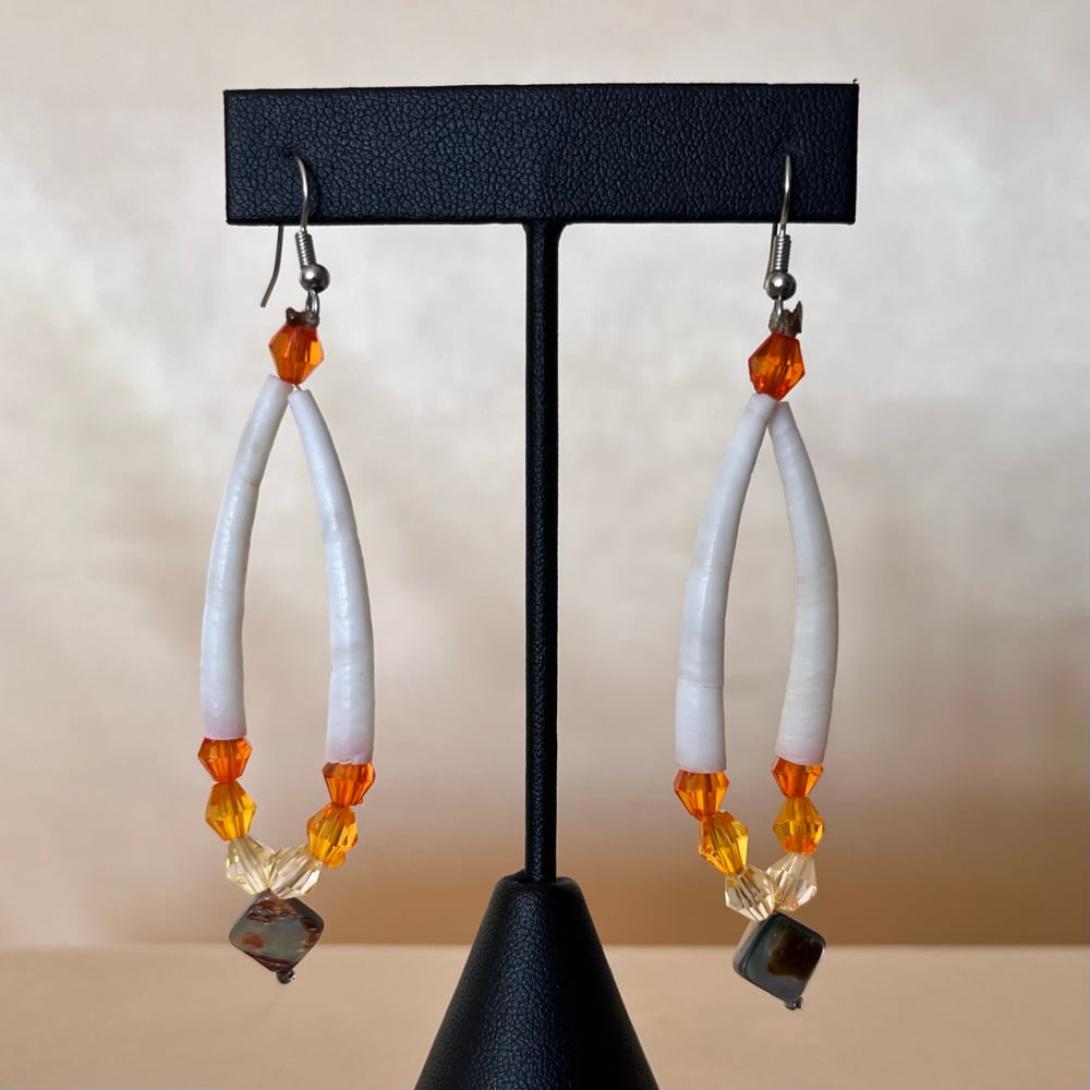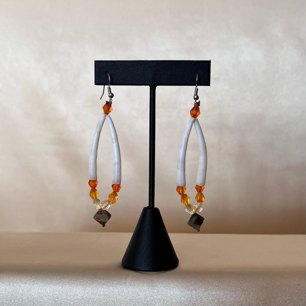 • Made from large smooth white Dentalium shells, faceted beads, and an abalone diamond shaped bead.