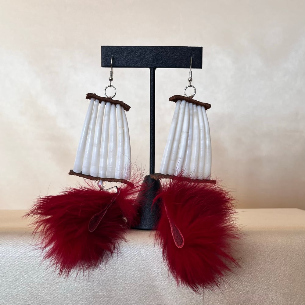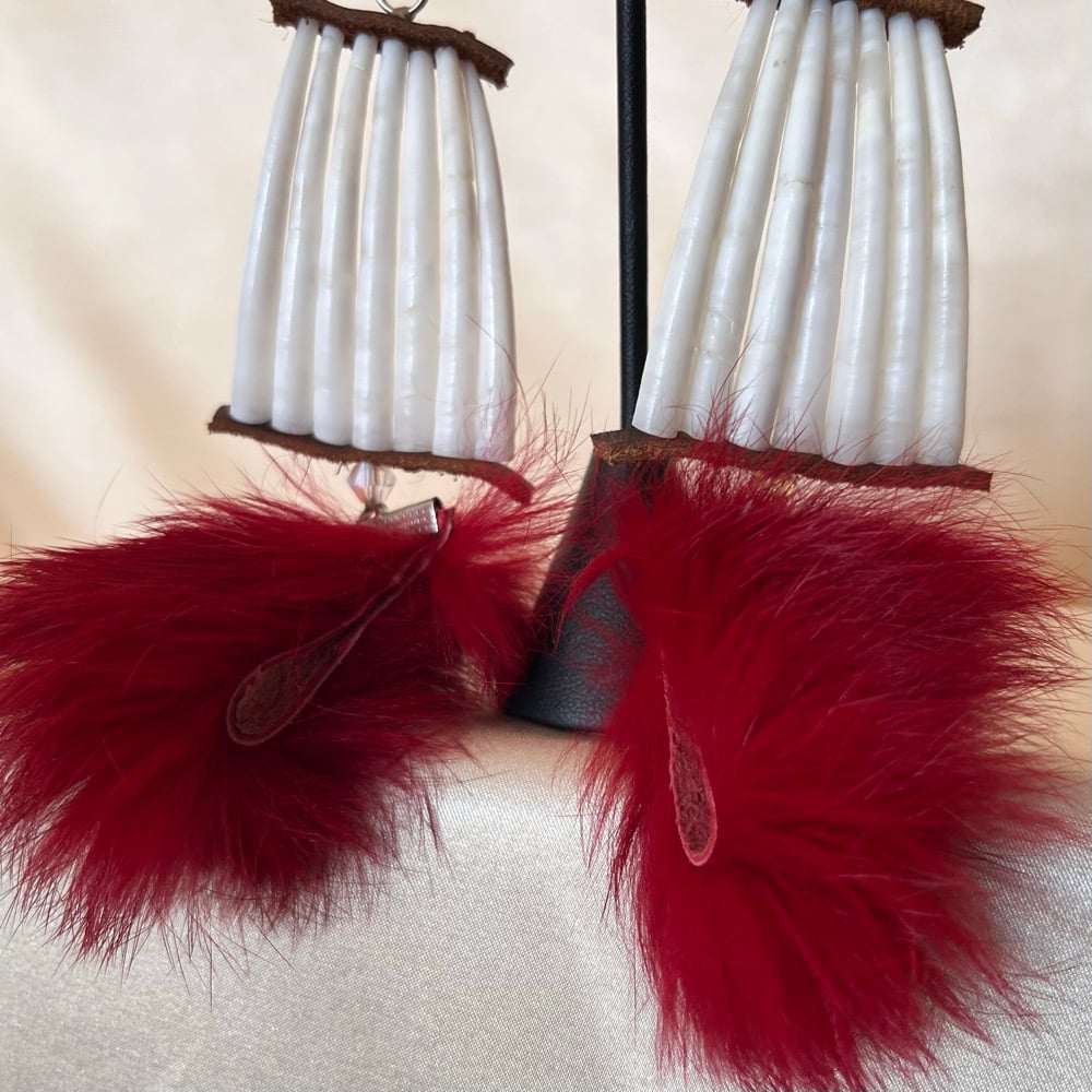 • Made from XL smooth white Dentalium shells, faceted crystal beads, deer leather, and red rabbit fur dangles.