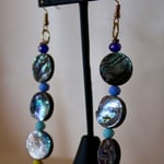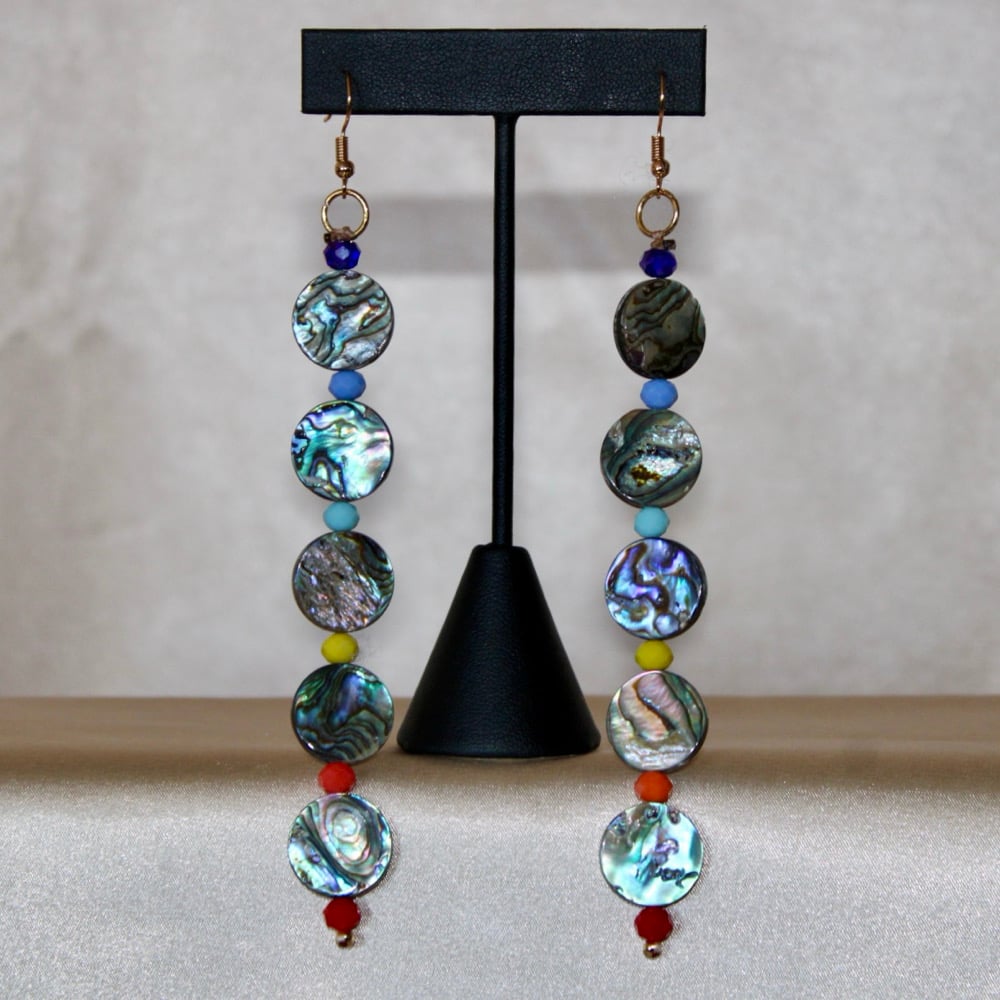 • Made from genuine abalone shell beads, and faceted glass beads. 18k gold plated hooks and findings.