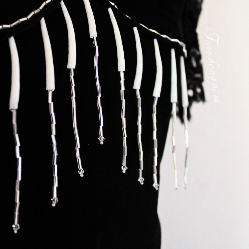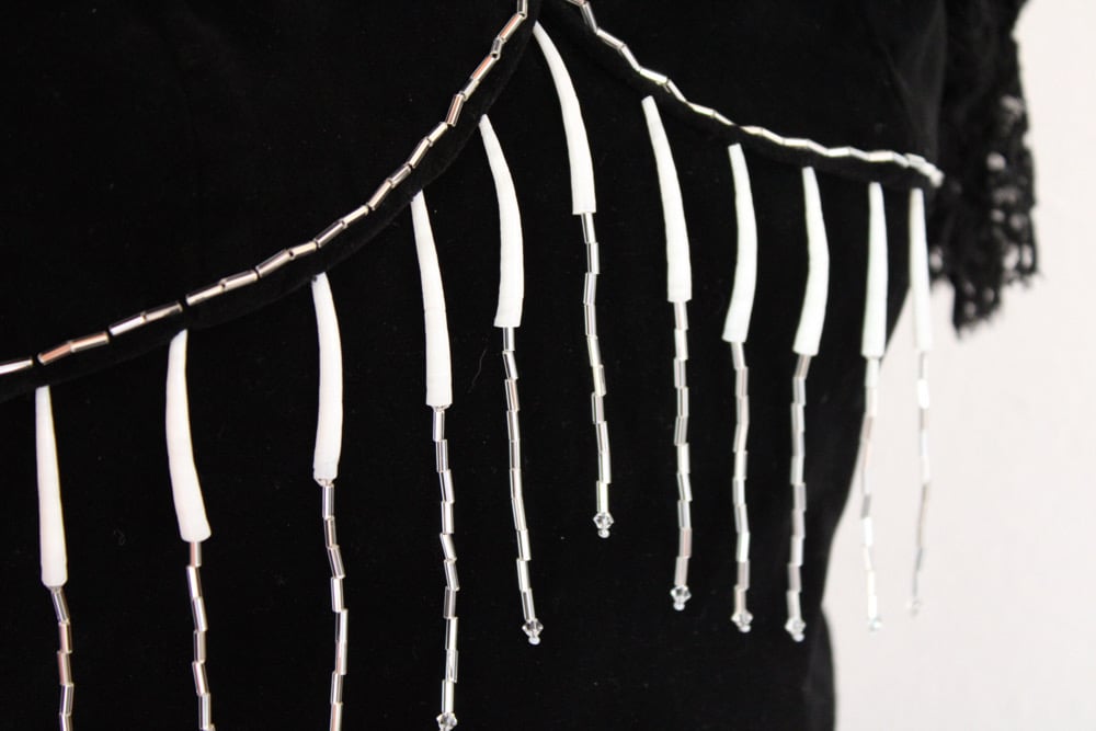 The Shadow Dancer Dress is an original Tuve’hongnöm design made from an upcycled velvet and lace upholstery. Natural XL dentalium shells with crystal bugle beads and bi-cone Swarovski beads. Zipper closure in the back. Lined but not serged. This design will not be replicated, it is an exclusive one of one garment.