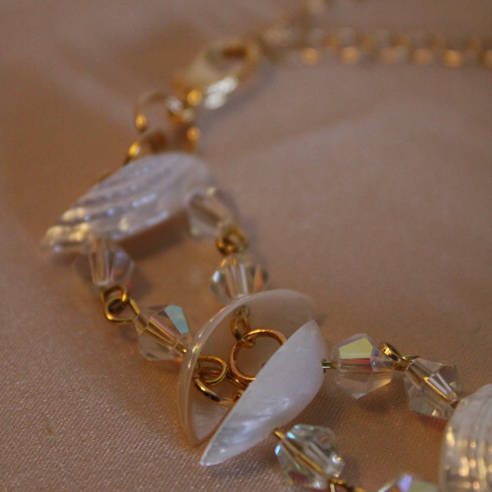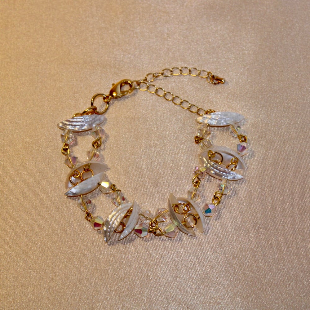 • Made from mother of pearl shells, and bi-cone crystal AB preciosa. 18k gold plated clasp and findings.