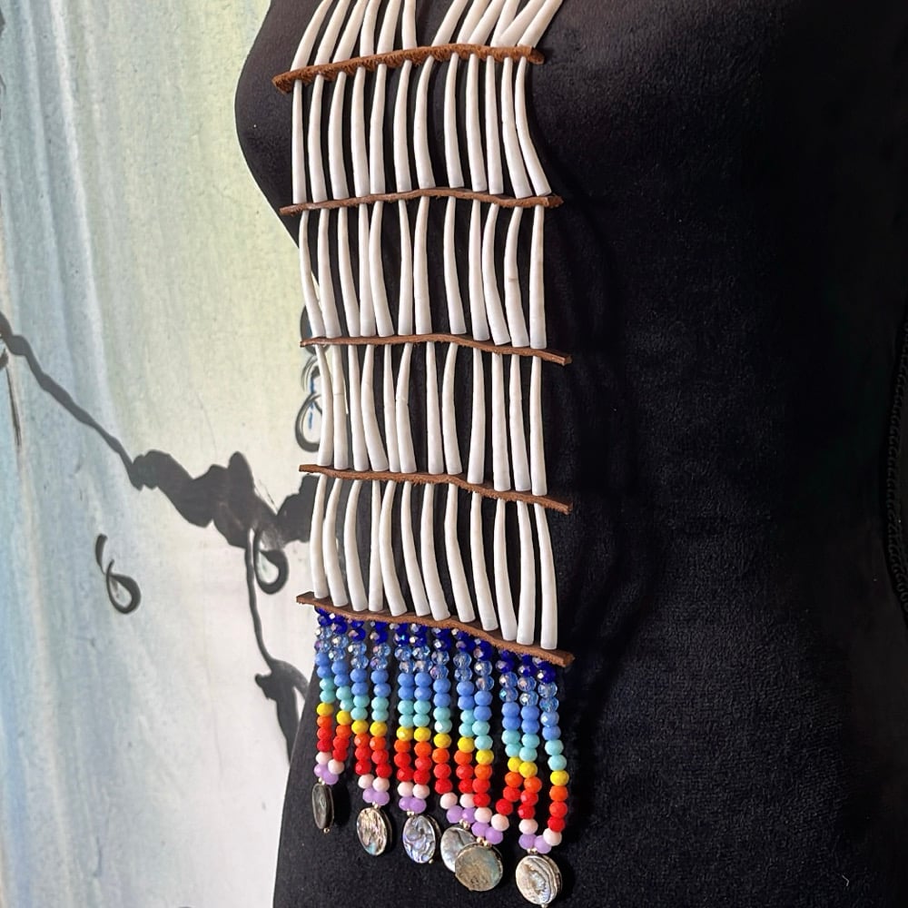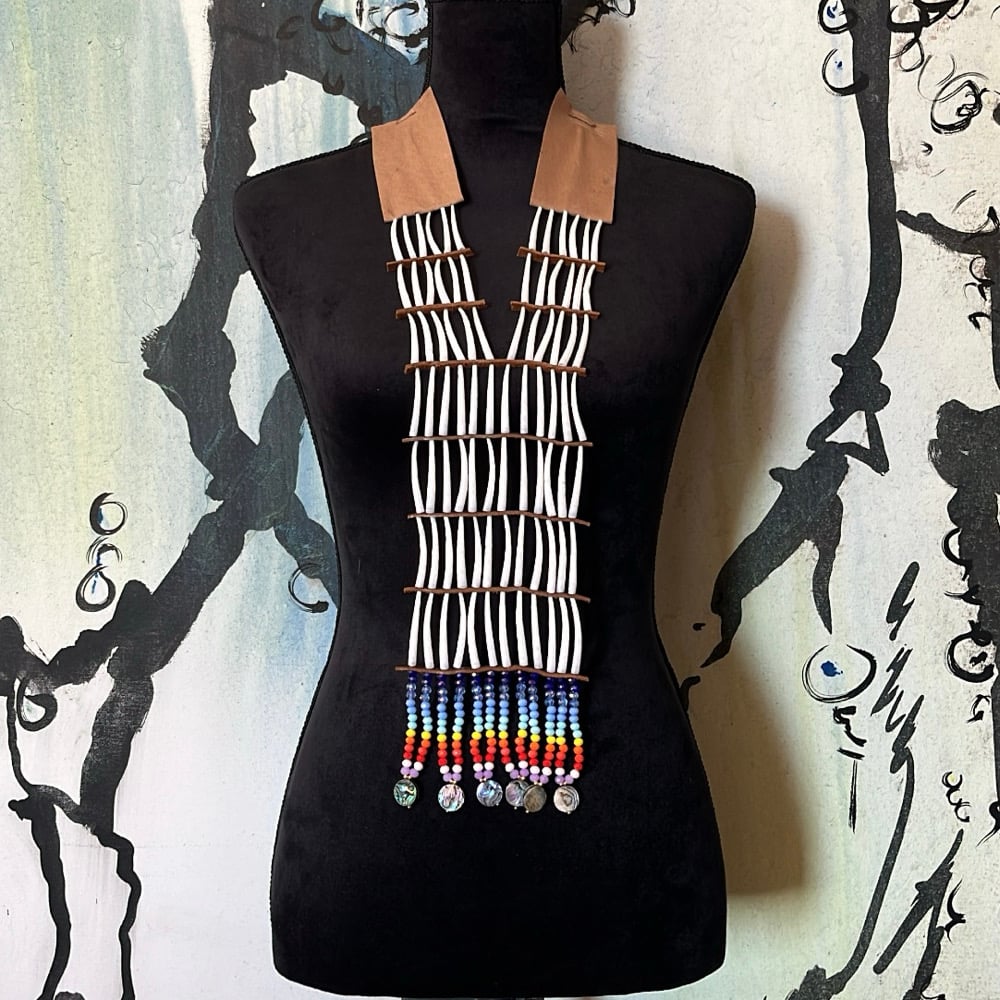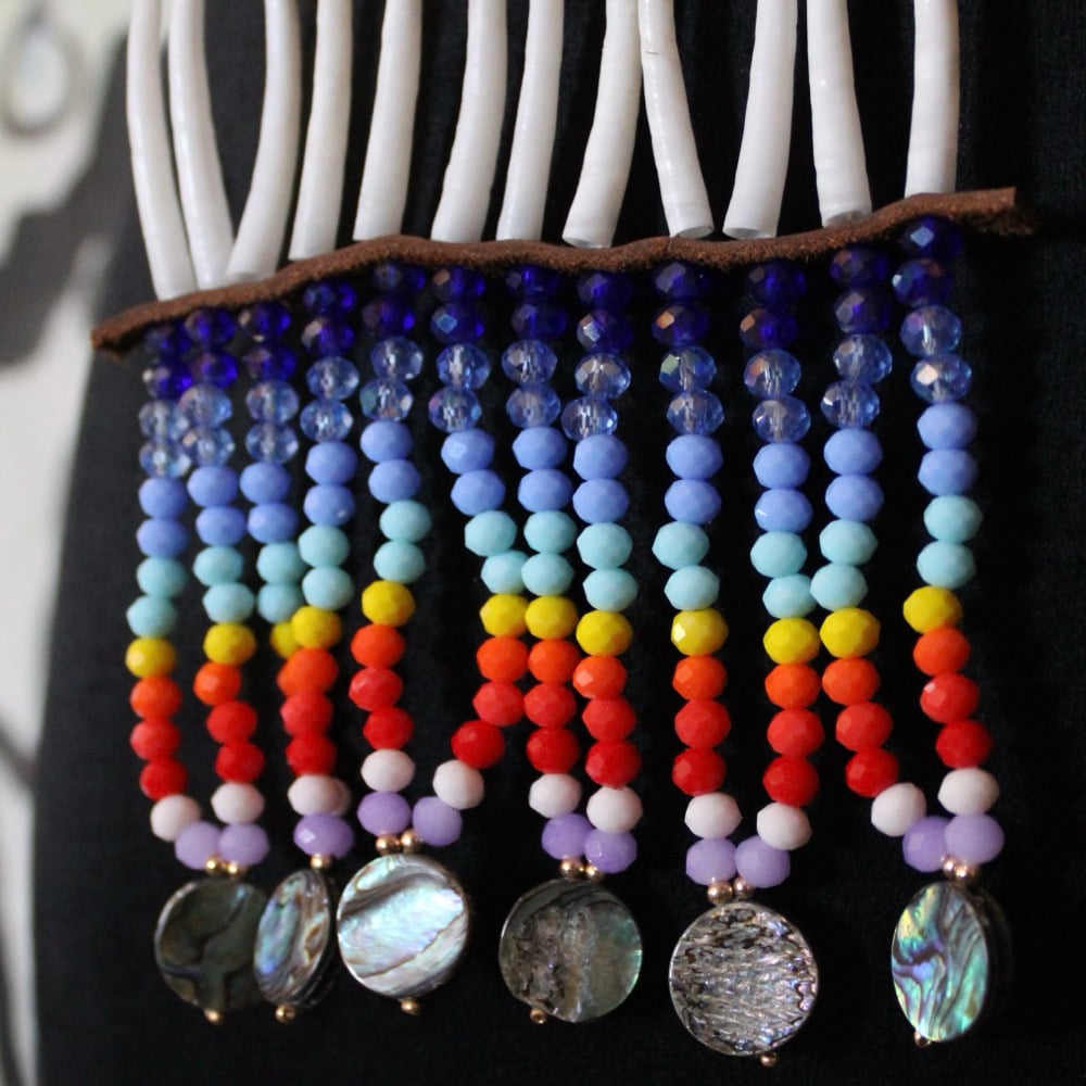 • Necklace: Made with XL (1.5”-2”) smooth white Dentalium shells, faceted glass beads, gold seed beads, brass beads, genuine abalone shell beads, and brown deer leather.