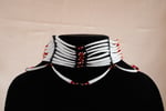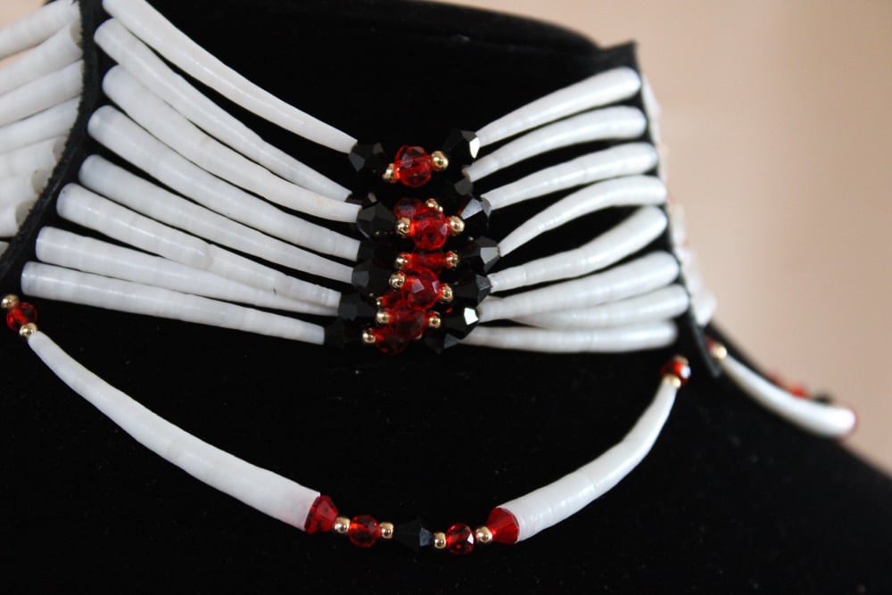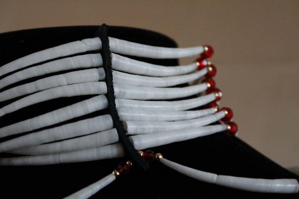 • Made with XL smooth white Dentalium shells, bi-cone Swarovski crystal beads, 24kt gold plated beads, and black deer leather.