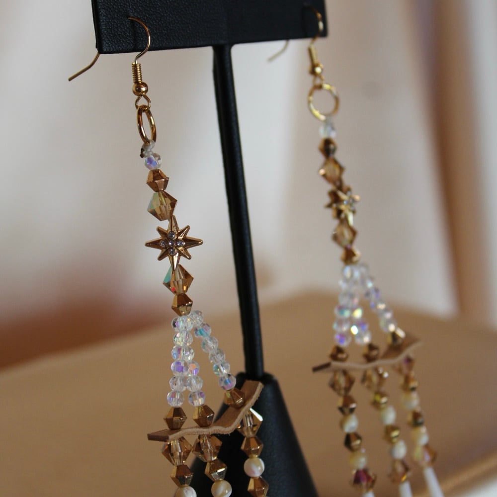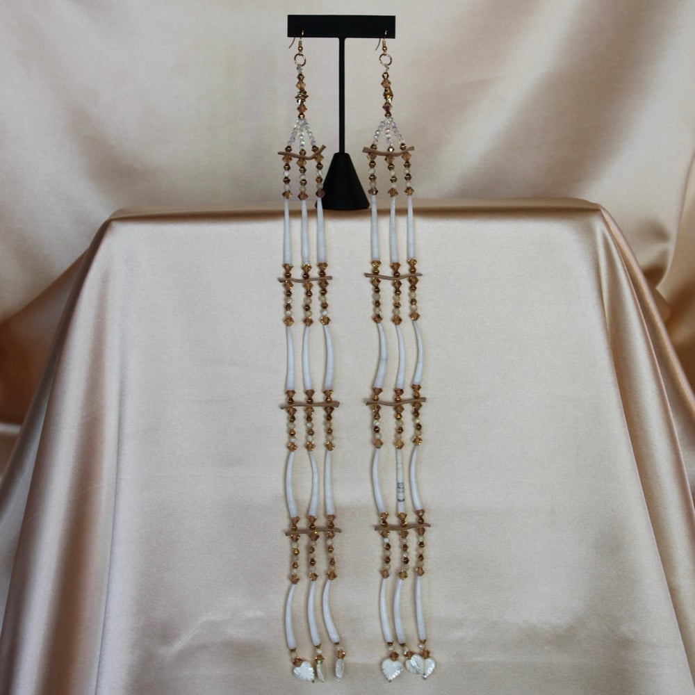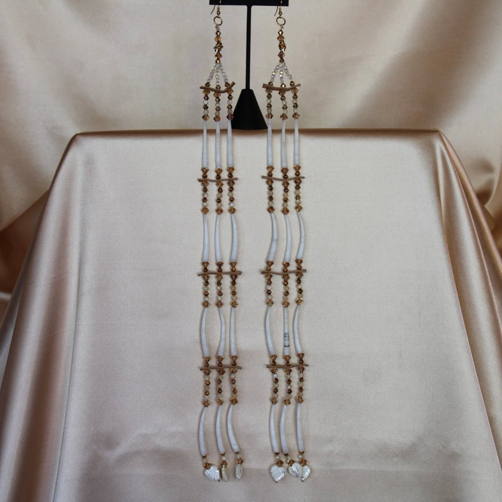 • Made from XL smooth white Dentalium shells, Preciosia bicone topaz colored crystal beads, faceted AB glass beads, gold plated starburst beads, gold plated bicone beads, brown/gold mother of pearl beads, carved white mother of pearl leaf beads, brown deer leather on 18k gold plated hooks/findings.